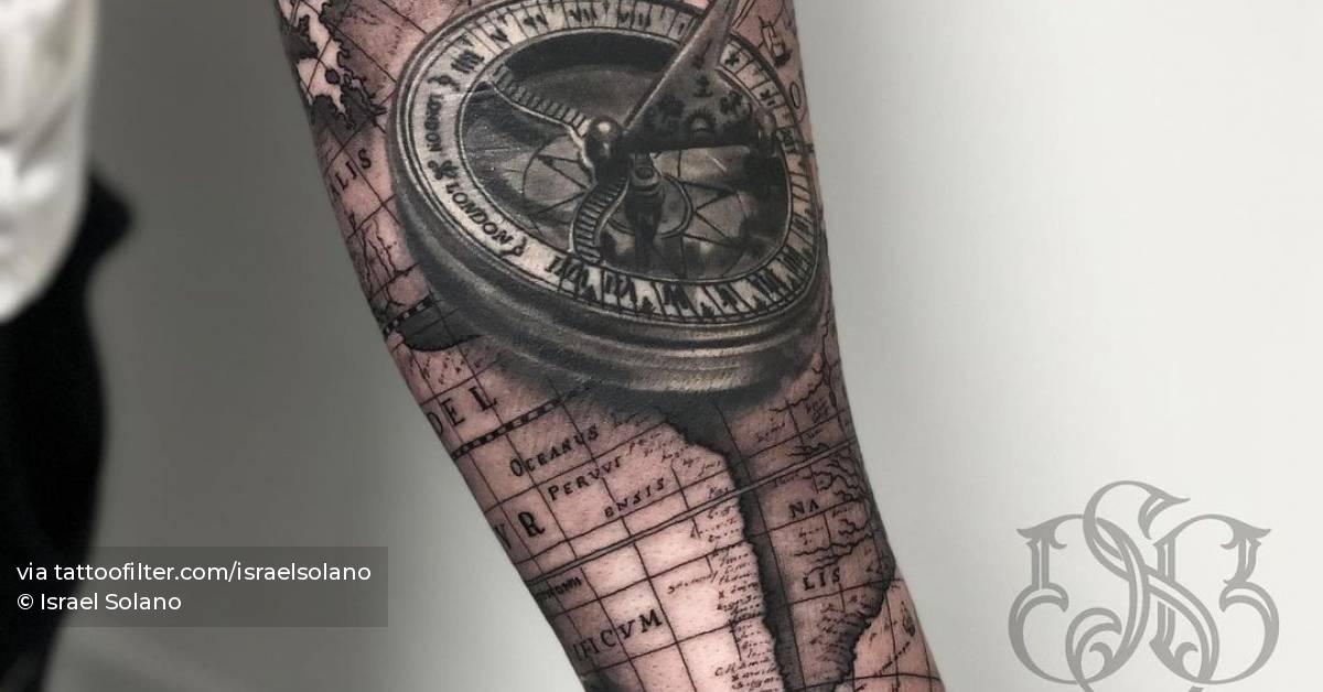 Black and grey world map and compass tattoo on the